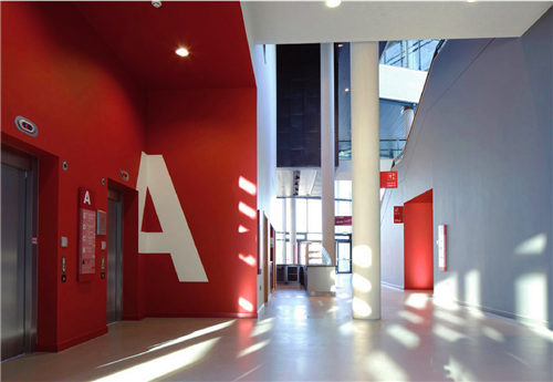 設(shè)計的核心在于利用顏色來區(qū)分大樓不同的功能區(qū)域。大號的字體設(shè)計遍布了大樓的墻體、電梯間、大堂和樓梯間,從陽臺到不同樓層間都能發(fā)現(xiàn)這些用心的設(shè)計。