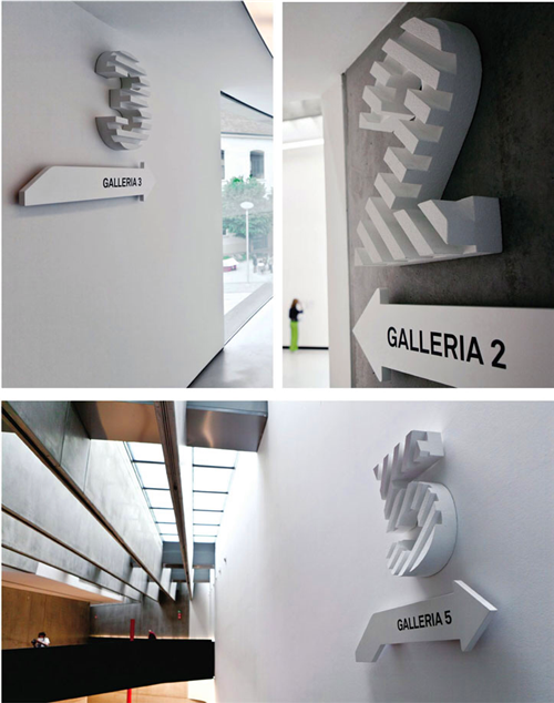 導(dǎo)視系統(tǒng)中的數(shù)字設(shè)計明確標(biāo)識出展覽廳的位置,標(biāo)識的設(shè)計猶如藝術(shù)品一樣精美、簡捷,沒有箭頭那樣強(qiáng)烈的標(biāo)識感,它們的地位好像博物館的主人一般。多虧了ma:d srl設(shè)計工作室的努力,意大利MAXXI國家藝術(shù)博物館才能成為一個吸引各國游客慕名而來的著名景點。