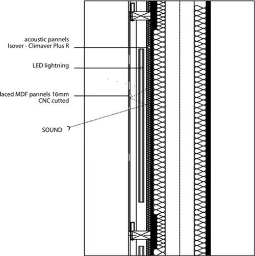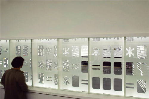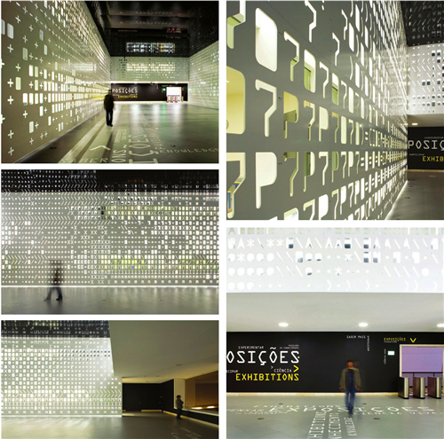 P-06 ATELIER設(shè)計工作室和建筑設(shè)計師Jo?o Luís Carrilho da Gra?a合作,對一個多功能的教學(xué)實驗室和一個名為“知識庫”的科學(xué)博物館進(jìn)行環(huán)境標(biāo)識的設(shè)計。設(shè)計的目的就是在垂直的空間里,利用不同的材料組成一個穿孔墻一樣的裝置,讓這個空間充滿了不同的聲音和折射出來的光,主題就是讓整個博物館猶如一個信息交換的中心,大家都可以實現(xiàn)信息共享。通過不同圖案的大小、聲音的強(qiáng)弱和空間的寬闊程度,設(shè)計師甚至在保持室內(nèi)光線充足的情況下,設(shè)置了白色的LED顯示屏。