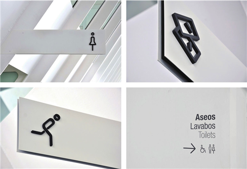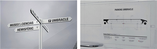 導(dǎo)視系統(tǒng)完美地結(jié)合了Calatrava的建筑風(fēng)格,設(shè)計師對博物館進(jìn)行了全面的導(dǎo)視系統(tǒng)設(shè)計,導(dǎo)視系統(tǒng)的靜態(tài)裝置和流動裝置都利用了新型的計算機(jī)技術(shù),做成了30個圖案信息導(dǎo)視裝置。