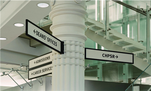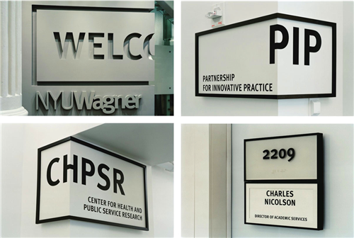 Pentagram設計工作室的設計師Michael Bierut為紐約大學羅伯特弗蘭克研究生的公共服務空間進行品牌設計。學校的歷史悠久,前身是位于華盛頓廣場公園古老的喬治亞大樓,設計師打算將學校的品牌從視覺化的平面擴展到環(huán)境的標識。