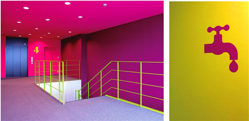 TERADADESIGN設計工作室負責對教室的室內顏色進行設計,同時也對學院的搖滾和流行樂教室進行導視系統(tǒng)設計。學院配備了錄音室、教學室和練習室,所有密封的教室都配備音樂教學設施。本來學院的教學氛圍就不太好,其中設備占了主要原因,設計師了解后決定嘗試用顏色改變學院的氣氛。不同顏色結合的同時也形成了學院獨特的特征,同時也可以作為學院的導視系統(tǒng)。