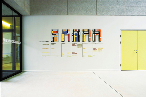 從標識的設計到學校中心的設計,從上到下都是為了營造一個充滿視覺沖擊力的空間。標識突出了整個設計理念,從教學樓整體的建筑結構就可以知道教室的具體位置,Bohatsch und Partner設計工作室用立方體標識牌的設計來表示不同教室的功能,采用樹脂玻璃作為可拆除的標識牌,目的就是為了將教室的功能在必要時可以進行轉換。