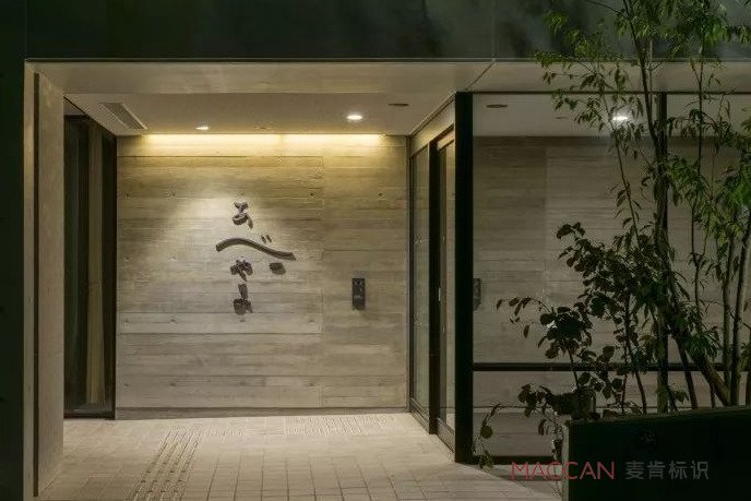 △養(yǎng)老院入口,以具有分量感的導(dǎo)視材質(zhì)凸顯空間的沉靜氛圍