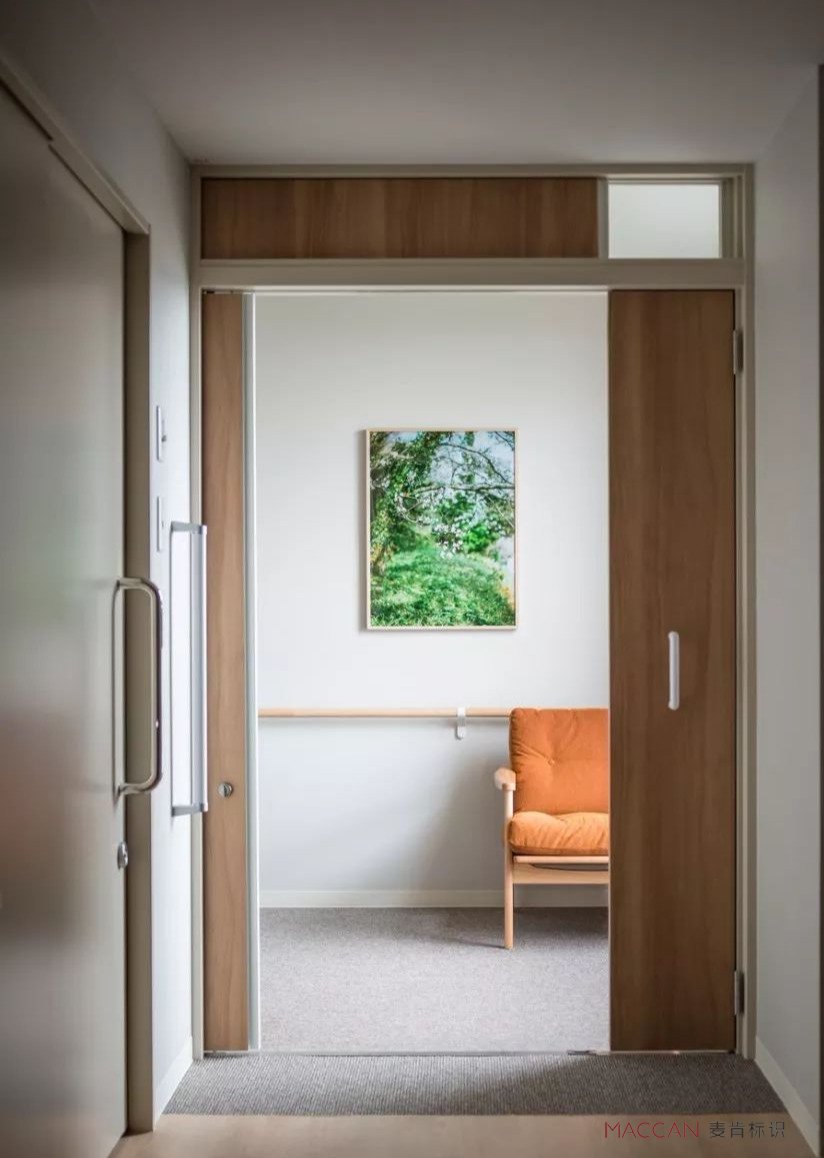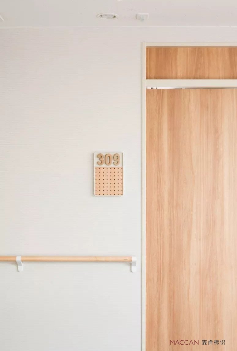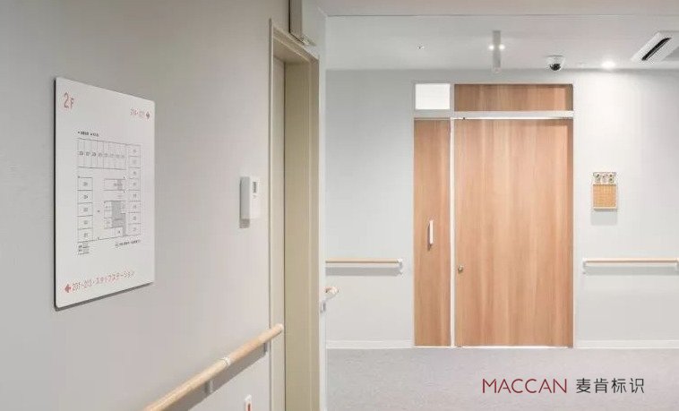 細(xì)看每一個(gè)房間的導(dǎo)視門牌,原來它們還特別作了向外傾斜的設(shè)計(jì),即使是坐在輪椅上的老人也能很清楚地識(shí)別。日本設(shè)計(jì)在細(xì)節(jié)上這么用心,還是挺讓人服氣的。