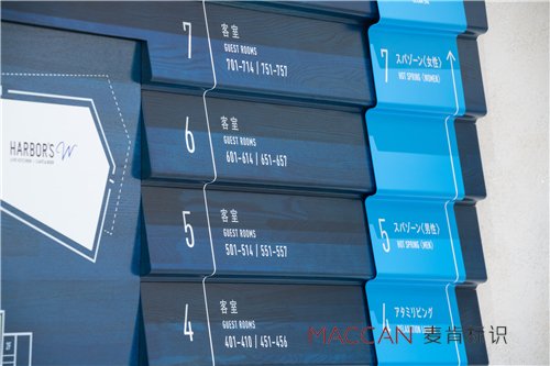 這套導(dǎo)視是日本Hokkyok設(shè)計(jì)工作室辦為Atami Bay Resort Korakuen度假村設(shè)計(jì),該導(dǎo)視系統(tǒng)采用貼墻式波浪型造型表現(xiàn),使用白色和海藍(lán)色做搭配,使用顏色來(lái)做功能空間的區(qū)分,使空間界限一目了然。