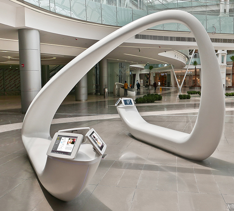 Abdali購物中心品牌的標(biāo)志是一個俏皮的“A”,充滿活力而又動態(tài),其導(dǎo)視系統(tǒng)融合了智能程序,安裝了多個平板電腦,可以讓客人便方便的了解購物中心的信息。