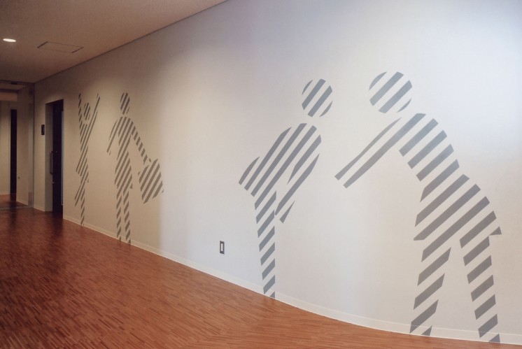 導(dǎo)視設(shè)計(jì)師以“孵化”為主題,設(shè)計(jì)了以女學(xué)生為基礎(chǔ)展開(kāi)的一系列icon,人物的頭部隨著場(chǎng)景變化而變化,使整體環(huán)境形成一致性。除了房間名稱(chēng)和標(biāo)志外,icon被放大作為環(huán)境圖形在公共場(chǎng)所自由出現(xiàn),均使用淡灰色斜條紋打造陰影效果。整套導(dǎo)視系統(tǒng)使用黑白灰的配色,打造了一個(gè)干凈整潔的空間。