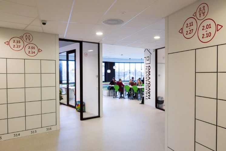 Krimpenerwaard學(xué)院 標(biāo)識(shí)系統(tǒng)設(shè)計(jì)與內(nèi)壁的圓形窗戶(hù)相呼應(yīng)
