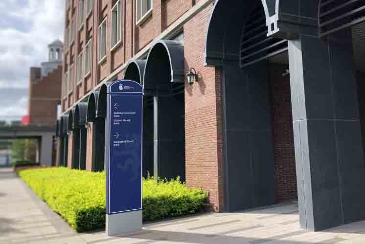 為了尋找到最合適的導(dǎo)視牌的設(shè)計(jì)結(jié)構(gòu),麥肯設(shè)計(jì)師們查閱了大量的資料,也對(duì)古羅馬建筑風(fēng)格做了大量的研究,最終提煉了標(biāo)識(shí)主體形態(tài),導(dǎo)視牌形狀與半圓形的拱券結(jié)構(gòu)做了完美結(jié)合,并將其貫穿于整個(gè)導(dǎo)視系統(tǒng)中,強(qiáng)化校園英倫文化品牌記憶,實(shí)現(xiàn)自然與人文環(huán)境的對(duì)話(huà),在設(shè)計(jì)領(lǐng)域刮起了一股英倫導(dǎo)視風(fēng)。
