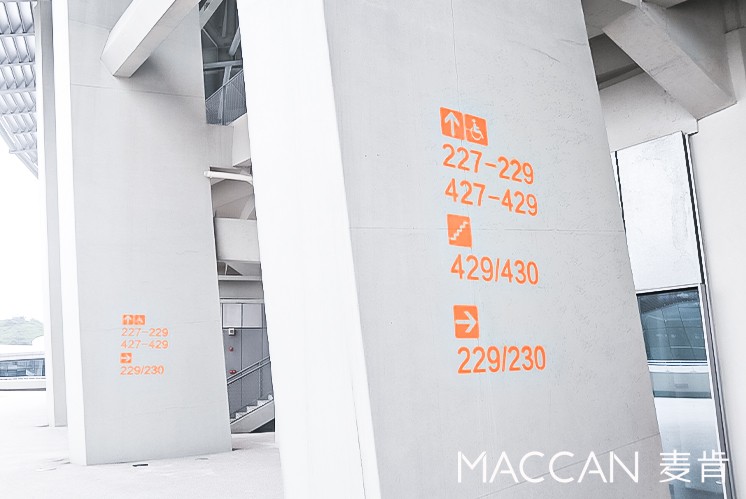 由麥肯標(biāo)識設(shè)計的江門濱江體育中心的標(biāo)識導(dǎo)視,體育館標(biāo)識鮮艷的紅色字樣,進(jìn)入室內(nèi),標(biāo)識牌大膽的橙色沖擊人們的視覺,給予方向鎖定,第一時間便可在空曠的體育館找到目的地地方向。顏色鮮艷的標(biāo)識牌傳達(dá)體育場館活躍、熱烈、激動的視覺氛圍,建筑設(shè)計和標(biāo)識導(dǎo)視設(shè)計無不充分融合,視覺統(tǒng)一,且有主有次。