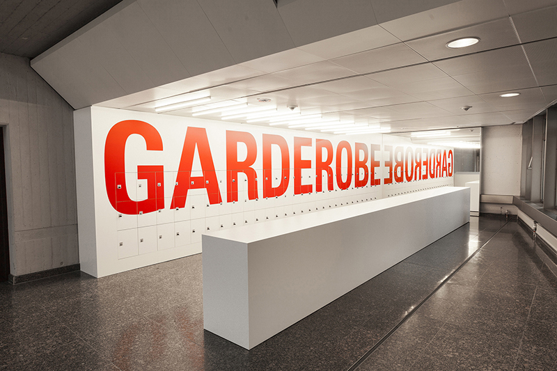 設(shè)計師采用易于使用的標識系統(tǒng)進行建筑空間布局的說明導航。在每一層的墻面上設(shè)置了超大醒目的紅色文字標識,保證在各個角度都容易被發(fā)現(xiàn)和看見,清晰明確地提供引導幫助。并且為了更加經(jīng)濟高效的工作,員工可以使用設(shè)計團隊開發(fā)的模板自行打印標簽,黏貼在可提供信息的位置即可。簡化的白色藝術(shù)空間與強大的視覺語言毫無違和感,加強了參觀者的的文化藝術(shù)體驗。