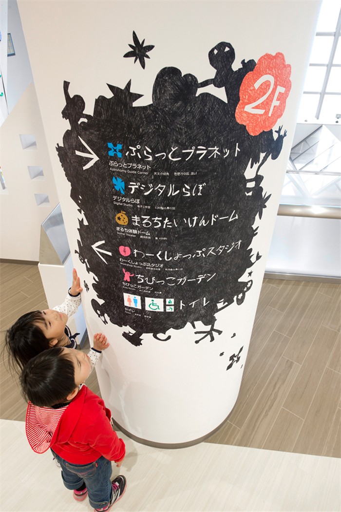 日本足立區(qū)享有盛譽(yù)的兒童未來創(chuàng)造館,擁有無數(shù)不同年齡段孩子可以體驗的玩樂設(shè)施,還有國內(nèi)最大的3層網(wǎng)編空間,1歲的孩子開始就能夠在里面自由行走爬行。在這里你還能進(jìn)行一場“神秘宇宙奇妙之旅”,通過體驗式互動交流和觀看SGI數(shù)字宇宙劇探索廣袤宇宙,玩轉(zhuǎn)星空,掌握科學(xué)文化知識。標(biāo)識設(shè)計中采用了宇宙探索之旅的元素,利用插畫、動畫的形式來傳達(dá)有趣的空間狀態(tài),孩子們通過富有想象力的視覺元素,沉浸于其中的游樂氛圍。此時標(biāo)識設(shè)計起到畫龍點睛,帶來二次創(chuàng)造的作用!