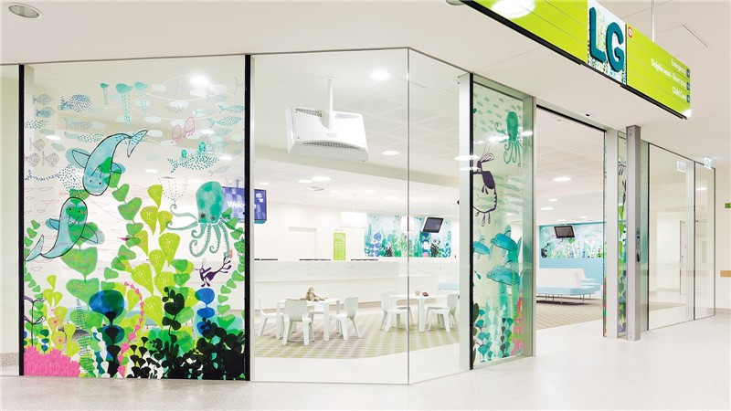 設(shè)計公司與插畫師Jane Reiseger合作為其創(chuàng)建了環(huán)境圖形設(shè)計和導(dǎo)視系統(tǒng)設(shè)計。整個設(shè)計的色彩靈感來自醫(yī)院標(biāo)志本身,基本圍繞標(biāo)志中的黃色、綠色、橘紅色、紅色、天藍(lán)色和深藍(lán)色為主要色調(diào)。設(shè)計師運(yùn)用了輕松的線條和色彩的搭配,繪制了大面積的墻壁插畫,為醫(yī)院增添了樂趣和活力,營造了一種豐富的視覺效果,讓患者、家長甚至是護(hù)士在這里感到放松和愉悅,舒緩了他們的緊張感。導(dǎo)視系統(tǒng)在設(shè)計上與建筑環(huán)境保持了整體的統(tǒng)一性,簡潔表達(dá),與室內(nèi)豐富多彩的裝飾形成鮮明對比,醒目但不突兀。對于如今很多一味追求硬件高大上的建筑來說,這座充滿愛和趣味的兒童醫(yī)院,充滿人性的關(guān)懷,讓建筑回歸服務(wù)人的本質(zhì)。最重要的是豐富的標(biāo)識視覺效果,讓患者、家長甚至是護(hù)士在這里感到放松和愉悅,舒緩了彼此之間的緊張感。