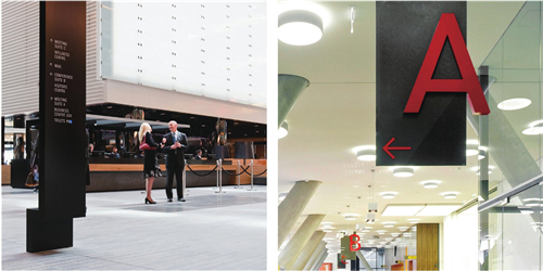 與公共空間導(dǎo)視系統(tǒng)不同的是,商業(yè)環(huán)境導(dǎo)視系統(tǒng)的利用空間都比較開闊,例如,商場、酒店與辦公寫字樓等。商業(yè)環(huán)境導(dǎo)視系統(tǒng)的設(shè)置更多安排在關(guān)鍵的指示區(qū)域,在大廳的主入口處、主要入口和通道、建筑物主體的入口正上方、室外扶梯客梯、中庭的邊緣位置、櫥窗與玻璃門、樓層的各個主次出入口等。