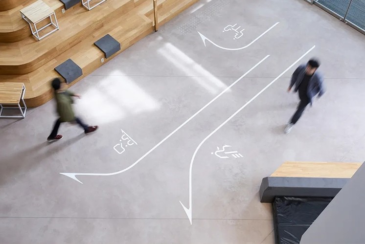 柱子、墻壁和地板上,箭頭與編號設計交織在一起,仿佛在講述一場體育賽事的故事。設計團隊巧妙地將體育精神融入工作環(huán)境,激發(fā)員工的團隊協(xié)作和競技熱情。編號設計不僅具有指示性,更通過其獨布局和色彩,空間充滿活力和節(jié)奏感。通過設置互動屏幕和信息點,員工可以輕松獲取最新的研發(fā)動態(tài)和合作信息。導視系統(tǒng)提升了空間的導航效率,通過游戲化的設計元素,增強員工的參與感和歸屬感。