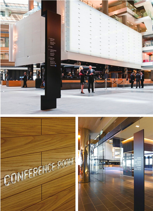 除了考慮到設(shè)計(jì)美感方面如何與建筑主體相呼應(yīng)以外,最重要的一個(gè)因素就是導(dǎo)視系統(tǒng)覆蓋的范圍,包括配備3部獨(dú)立電梯的13個(gè)樓層,以及采光通風(fēng)的中庭。