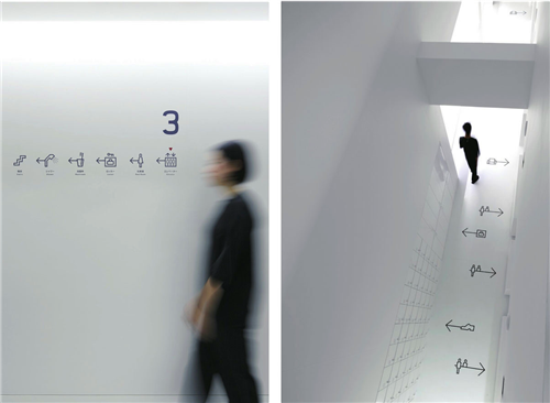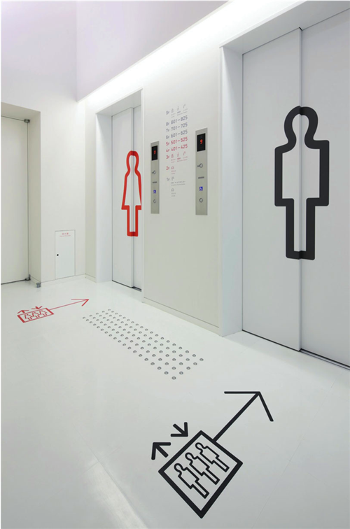 平面設(shè)計(jì)師、室內(nèi)設(shè)計(jì)師和產(chǎn)品設(shè)計(jì)師在設(shè)計(jì)前期經(jīng)過不斷地討論和研究,通過分享不同設(shè)計(jì)領(lǐng)域的設(shè)計(jì)理念,最終讓想法變成現(xiàn)實(shí)。就導(dǎo)視系統(tǒng)而言,墻體上和地板上的圖示符號(hào)清晰、明了地指明不同設(shè)施的位置,對(duì)于不同語言的外國(guó)游客同樣適用。