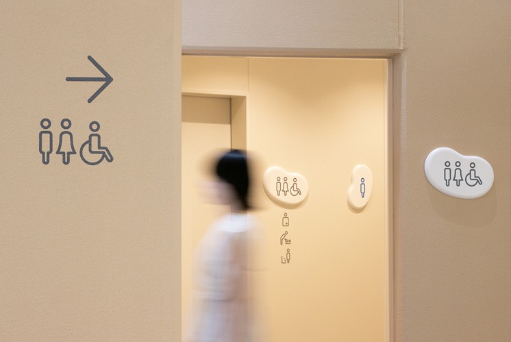 形狀設(shè)計(jì)是標(biāo)識(shí)系統(tǒng)的核心亮點(diǎn),蠶繭的有機(jī)形態(tài)被貫穿始終。從入口處的導(dǎo)視牌到各功能區(qū)的標(biāo)識(shí),都采用了圓潤(rùn)流暢的繭形輪廓,打破了傳統(tǒng)標(biāo)識(shí)常見(jiàn)的生硬幾何形態(tài)。例如導(dǎo)視牌的不規(guī)則橢圓、母嬰室標(biāo)識(shí)的柔滑曲線,乃至衛(wèi)生間標(biāo)識(shí)的繭狀造型,都呼應(yīng)著建筑外觀的繭形特色,讓標(biāo)識(shí)與空間形成渾然一體的視覺(jué)語(yǔ)言。這種充滿自然感的形態(tài),不僅契合兒童對(duì) “柔軟、可愛(ài)” 事物的感知偏好,也讓整個(gè)設(shè)施的空間語(yǔ)言更具連貫性,仿佛一個(gè)個(gè)蠶繭在建筑中自然生長(zhǎng)、指引方向。
