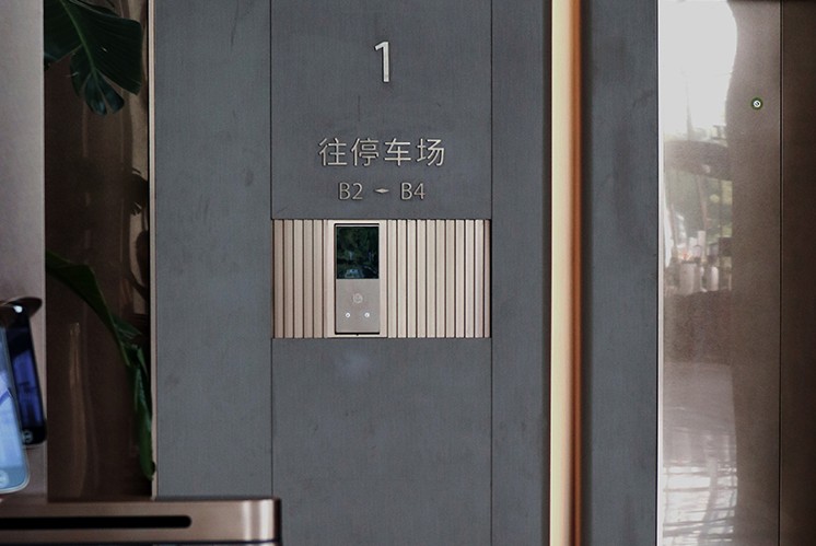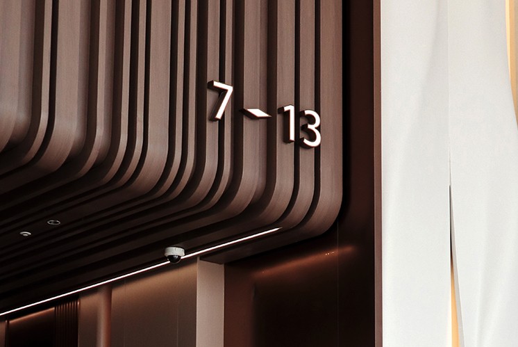 樓層標(biāo)識(shí)在燈光映襯下清晰醒目,與空間中弧形木紋裝飾形成呼應(yīng),既實(shí)現(xiàn)了功能導(dǎo)視,又成為大廳藝術(shù)細(xì)節(jié)的一部分,讓來者在踏入辦公區(qū)域的第一刻,便感受到空間的雅致格調(diào)。