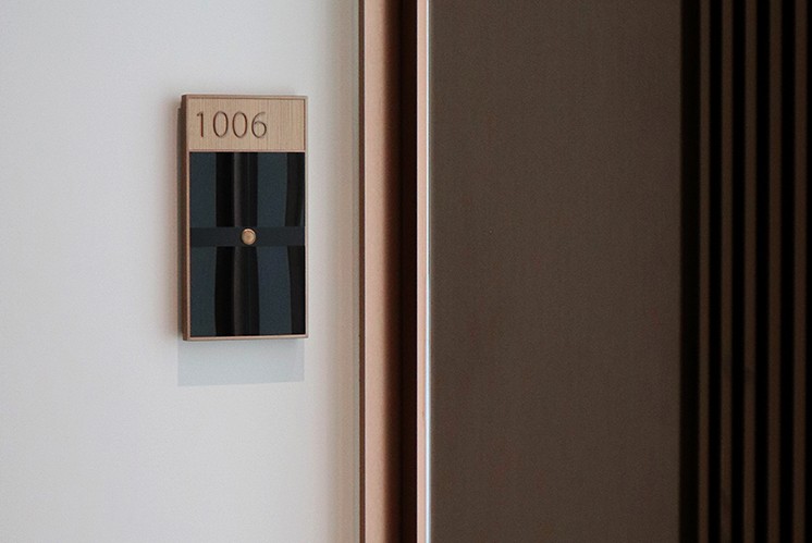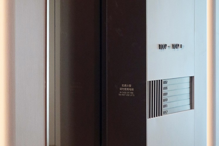 電梯廳的門戶導(dǎo)視牌以簡潔的排版、清晰的字體,快速傳遞信息,在淺色材質(zhì)與燈光的配合下,既不喧賓奪主,又能在需要時(shí)快速被識(shí)別。
