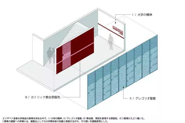 審查評語:在廣島成為焦土的小音樂學(xué)校,現(xiàn)在是伊麗莎白音樂大學(xué)。一個音樂名人堂完成了反復(fù)研究的主題“格里高利頌”。我們在墻壁的每一面墻上應(yīng)用了六次教堂儀式,并將整個玻璃幕墻上的誦經(jīng)合唱得分排列成一個圖案。重疊構(gòu)成了獨特的建筑外觀,在遠(yuǎn)景中是一個很好的標(biāo)志。在前景的內(nèi)部,光影所產(chǎn)生的樂譜,帶出了吟唱本身的旋律,將學(xué)生的心靈引向純粹的音樂。