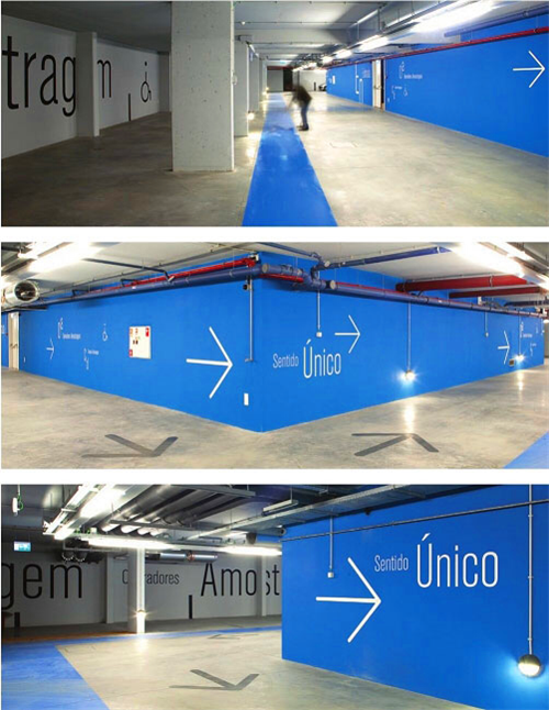 葡萄牙設(shè)計公司“P-06 ATELIER”與建筑公司“Goncalo Byrne”合作完成了該辦公空間的導(dǎo)視系統(tǒng)設(shè)計。通過縮減名字和夸大字母大小對比的方法,把化學(xué)方程式的圖案應(yīng)用在導(dǎo)視設(shè)計中。在墻面、地板上大塊區(qū)域內(nèi)大規(guī)模地應(yīng)用這種手法,更便于來訪者的遠(yuǎn)距離閱讀。