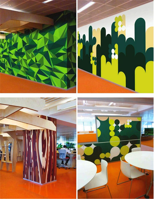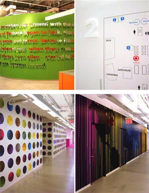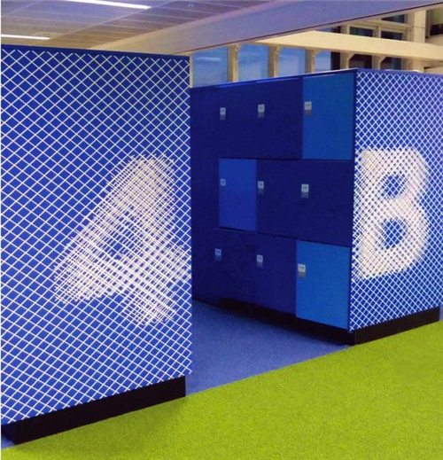 此外,結(jié)合整個辦公環(huán)境,每個樓層都要有與建筑本身色調(diào)相匹配的字體和主色,而且各樓層上標(biāo)識的位置必須保持一致。此種設(shè)計將使空間的視覺效果大為提升。非正式的聚集場所也都擁有自己的獨特標(biāo)識。各樓層的會議室被命名為“會議帳篷”;“聊天盒”用以命名信件收發(fā)室;就連操作室也被用以大膽、有趣的圖形來加以裝飾。
