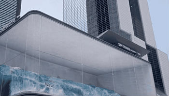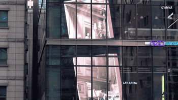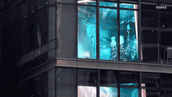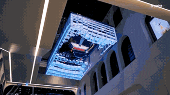再來看看這塊屏幕有多神奇。一塊屏幕斜在建筑內(nèi),透過建筑外立面的玻璃你就能感受到不一樣的VR體驗(yàn)。