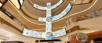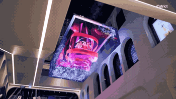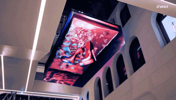商場里大堂天花板,用一塊尺寸為3.5m X 6m X 1.5m的立方體LED屏倒掛在天花板。