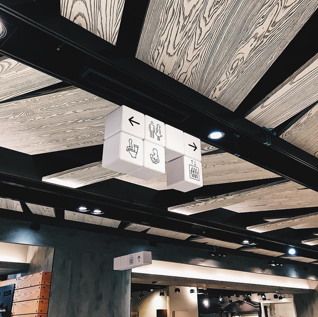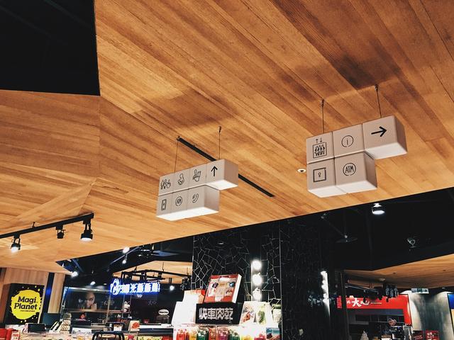 商場(chǎng)吊牌都采用了三聚氰胺板制成的正方體塊相組合的形式展示,多樣的組合形式讓它形式多變但風(fēng)格統(tǒng)一,配合以簡潔的標(biāo)識(shí),成為裝飾它的一部分。讓它很好的融入了整個(gè)環(huán)境中,有沒有很像俄羅斯方塊!