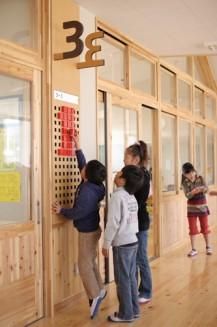 日本基山小學(xué)利用自然環(huán)境,將學(xué)校建筑材料—木材,與整個導(dǎo)視系統(tǒng)結(jié)合,基于木材的原始色彩,配合視覺上很容易理解的的顏色來完成整個導(dǎo)視標(biāo)識設(shè)計與教室的區(qū)分。導(dǎo)視標(biāo)識牌數(shù)字以積木的形式來完成,學(xué)生們自己可以插入積木,根據(jù)他們的班級和學(xué)年來調(diào)整積木的高度與數(shù)字。整個導(dǎo)視設(shè)計希望每個學(xué)生每年都能通過這種調(diào)整班級積木的形式來增進(jìn)其對班級學(xué)校的熱愛!