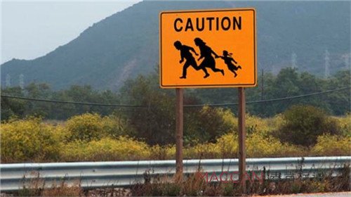 在美國高速公路你可以看到一家三口手牽手拉著跑的街道路邊標(biāo)識牌,代表的意思是美國有很多非法移民,因為沒有有效身份證,因此你在高速公路上開車,就要注意到這些常常為了躲避檢查而驚慌逃跑的非法移民。