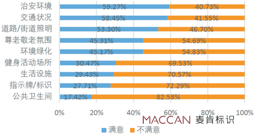 第4次中國(guó)城鄉(xiāng)老年人生活狀況抽樣調(diào)查數(shù)據(jù)顯示,老年人對(duì)社區(qū)環(huán)境中各個(gè)項(xiàng)目的滿意度普遍較低。數(shù)據(jù)顯示,治安環(huán)境的滿意度最高,不足60%,標(biāo)識(shí)牌/標(biāo)識(shí)的滿意度低下,僅為27.71%,滿意度水平有待提升。