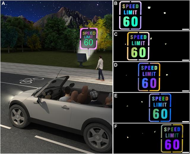 在實(shí)驗(yàn)中,研究人員用這種反光薄膜制作了一個(gè)帶有數(shù)字和字母的限速標(biāo)志,并在它附近放置了一盞白色光源。結(jié)果顯示,當(dāng)駕駛員快速的通過時(shí),能看到標(biāo)志上的內(nèi)容似乎隨著位置的移動(dòng)而閃爍;在另一組實(shí)驗(yàn)中,研究人員把這種反光材料貼在車道線上,結(jié)果車輛經(jīng)過時(shí)能看出車道線反射了前車的燈光,變得很明亮。對(duì)于駕駛員來說,標(biāo)志上的顏色明亮而穩(wěn)定,但對(duì)于路邊的行人來說,路標(biāo)的顏色似乎在隨著汽車的飛馳和燈光的照射而閃爍。