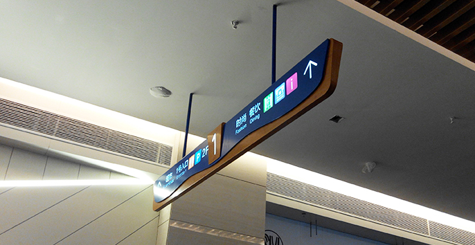 麥肯團(tuán)隊(duì)對(duì)SM淄博淄川城市廣場(chǎng)的空間形態(tài)、建筑造型、外觀裝飾風(fēng)格進(jìn)行實(shí)地考察,根據(jù)廣場(chǎng)主軸線景觀——綠洲,將標(biāo)識(shí)材料選定為不銹鋼與木紋搭配,與環(huán)境相融合。導(dǎo)視系統(tǒng)采用藍(lán)色作為點(diǎn)綴裝飾,既保持整體性,同時(shí)彰顯室內(nèi)設(shè)計(jì)的水系概念。