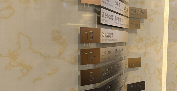 麥肯設(shè)計方案的出發(fā)點注重與空間環(huán)境的緊密結(jié)合度,在簡約的標識設(shè)計靈感下,充分考慮周大福大廈空間的屬性和使用人群,并結(jié)合室內(nèi)裝飾特點進行提取糅合,從而通過標識設(shè)計更好地展現(xiàn)出環(huán)境空間的裝飾性以及集團品牌系統(tǒng)的強大性和品質(zhì)感。