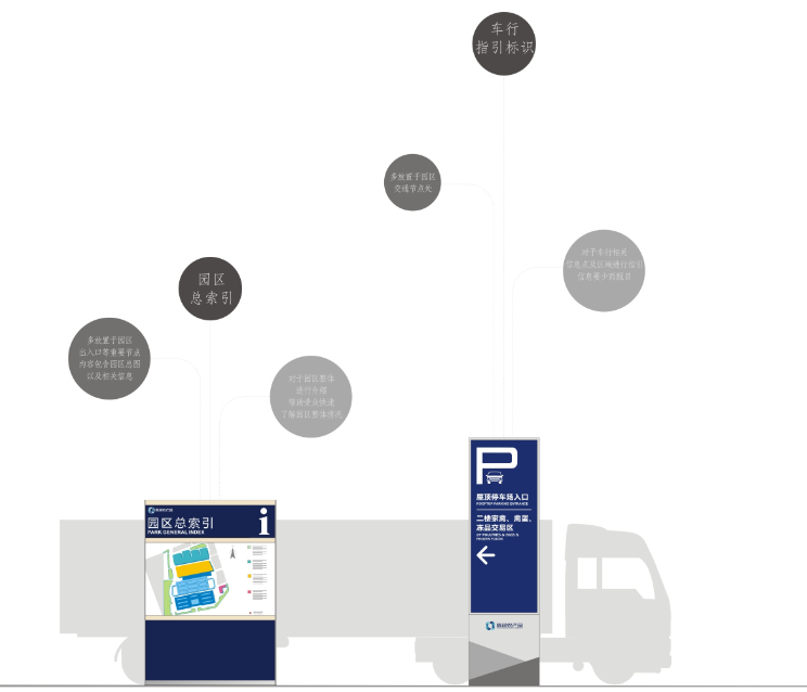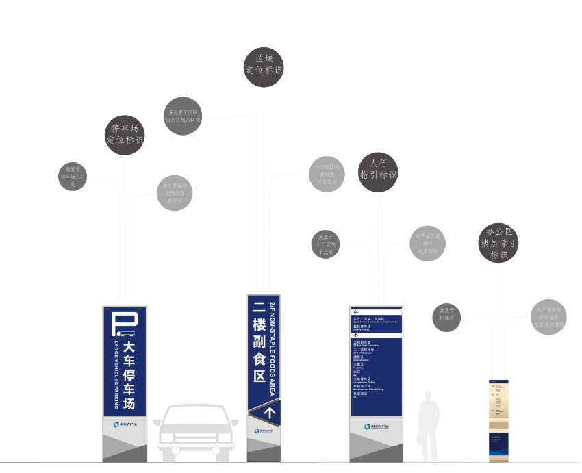 以藍(lán)白色為主調(diào),很符合工業(yè)園區(qū)環(huán)保簡潔氛圍,整體系統(tǒng)簡潔大方。將其功能性發(fā)揮到最大化。在直觀明了的導(dǎo)視牌面輔以三維化導(dǎo)視牌,讓路癡的你也有了方向感。