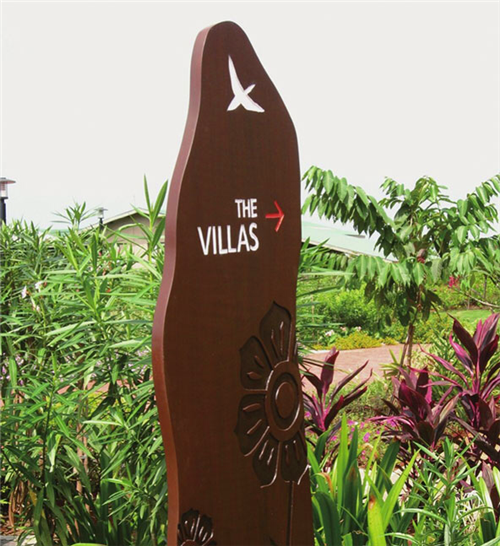 園林景觀是一個戶外開放型的公共空間,從基本特征來看,園林占地面積大、樹木的遮蔽性大、景點比較分散、環(huán)境的可識別性相對弱,游客迫切地需要一個導向明確而簡捷的導視系統(tǒng)。園林景觀的導視系統(tǒng)主要有園林平面圖、場所方位指示和場所標識、科普文化標識、警示標識等。有的公園還配備了導游手冊,主要是將道路、景觀、場所一一標注出來,只要你一進入公園就可以將公園的結(jié)構(gòu)看得一清二楚。在設計時應考慮既不能破壞園林整體氣氛,又可以達到引導、吸引游客的目的。由于范圍廣泛,園林的導視密度相對降低,體量感相對增大,而且導視系統(tǒng)設計風格、色彩統(tǒng)一性,以及形式感都可以相對自由、新穎,給人深刻印象。