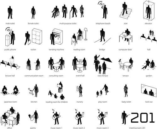 象形符號的設(shè)計靈感來源于生活中不同的場景。設(shè)計這樣一套符號的目的是為了讓大家了解這里是一個公眾交流的場所。通過將生活交流場景進行視覺化設(shè)計,電話交流、面對面交談、人們行走等一系列日常的行為和生活場景都通過這樣的設(shè)計表現(xiàn)出來。