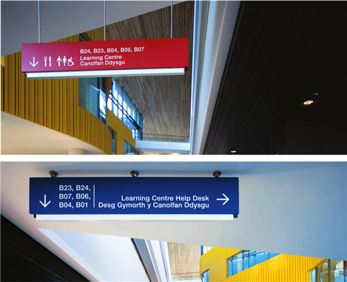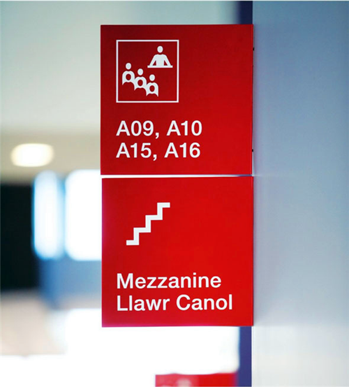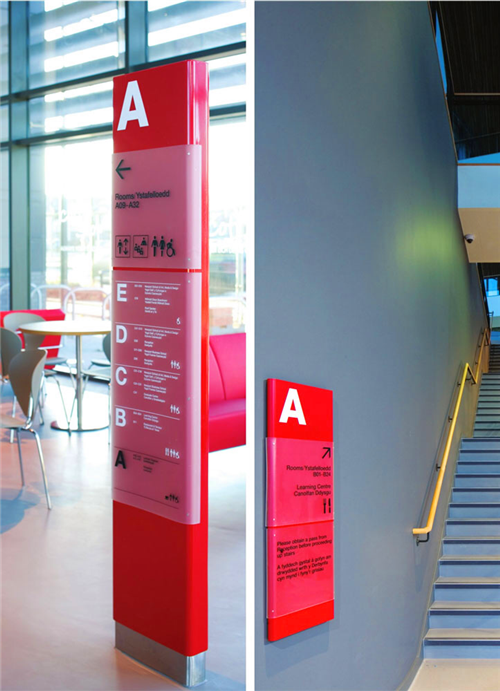 威爾士大學聚集了來自不同地區(qū)的學生,所以在導視標識上必須要有兩種不同的語言。設(shè)計師使用了英語和威爾士語,結(jié)合國際普遍認可的審美標準,讓字體具有強烈的視覺沖擊力。
