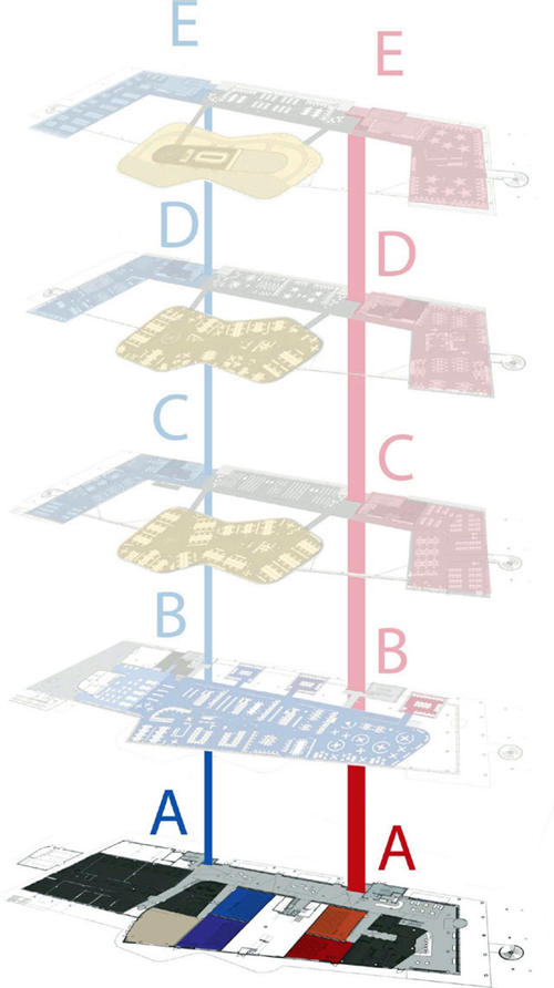 設(shè)計的核心在于利用顏色來區(qū)分大樓不同的功能區(qū)域。大號的字體設(shè)計遍布了大樓的墻體、電梯間、大堂和樓梯間,從陽臺到不同樓層間都能發(fā)現(xiàn)這些用心的設(shè)計。