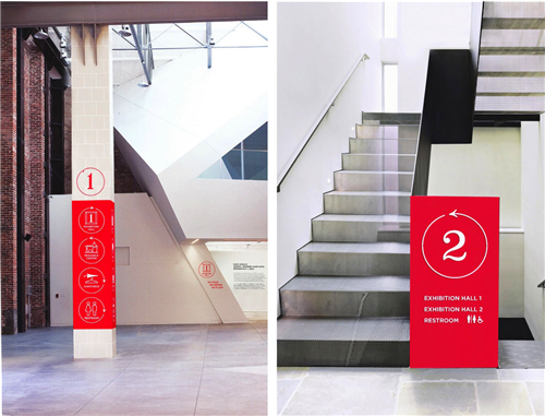 文化場館導視系統(tǒng)與公共空間導視系統(tǒng)、商業(yè)環(huán)境導視系統(tǒng)相同,系統(tǒng)性是其特征之一??梢哉f,系統(tǒng)性是所有導視系統(tǒng)的基本屬性之一。每個導視系統(tǒng)中所有的設(shè)計元素:圖案、數(shù)字、文字、箭頭、顏色、物料等,都圍繞該建筑功能特點進行設(shè)計。文化場館導視系統(tǒng)的設(shè)計需要營造一種特殊的文化氛圍,讓觀眾走進文化場館時就能感受到文化帶來的愉悅心情,甚至讓導視系統(tǒng)的設(shè)計在一定程度上成為文化場館的藝術(shù)品,無論是室內(nèi)還是室外的標識設(shè)計。因此文化場館導視系統(tǒng)在設(shè)計上要符合大眾的基本審美規(guī)律的同時,還要讓導視系統(tǒng)設(shè)計元素在設(shè)計上富有審美的價值特征,讓整個導視系統(tǒng)在尺寸、文字、色彩上滲透出不一樣的文化氣息。