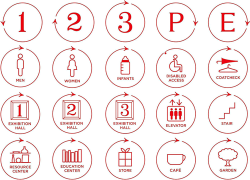 圓圈是標識設(shè)計的另外一個元素,它代表了一種循環(huán),同樣代表了日本文化的美學價值。而且,作為導視系統(tǒng)設(shè)計而言,同樣是一個不錯的設(shè)計元素。標識中的小圓點代表了博物館內(nèi)指引的方向,取代了傳統(tǒng)的箭頭設(shè)計。