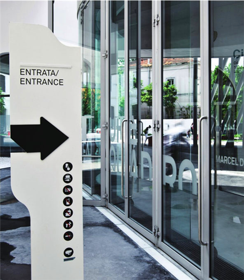 文化場館導(dǎo)視系統(tǒng)的室內(nèi)設(shè)計不像商業(yè)環(huán)境導(dǎo)視系統(tǒng)那樣帶有商業(yè)目的、強(qiáng)調(diào)品牌的正面形象,與公共空間導(dǎo)視系統(tǒng)相似,都起到了扮演傳播信息的主要作用,文化場館導(dǎo)視系統(tǒng)最特別的地方在于對文化性和美學(xué)設(shè)計要求比其他導(dǎo)視系統(tǒng)都要高。文化場館導(dǎo)視系統(tǒng)的戶外設(shè)計最突出的特征就是主體設(shè)計的建筑本身可以作為一個導(dǎo)視系統(tǒng)的標(biāo)志。