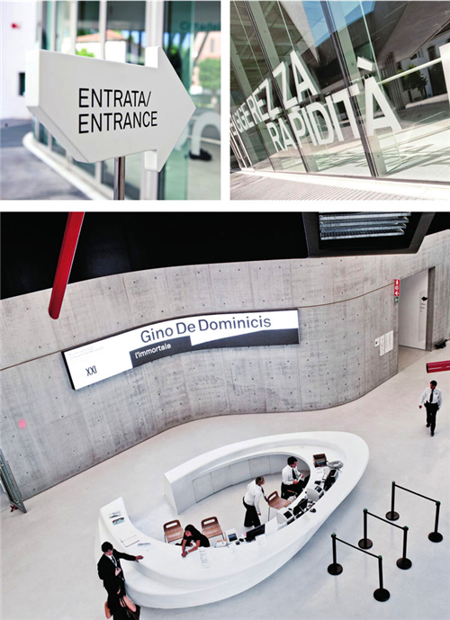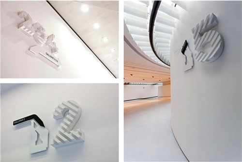 由于受到建筑本身的設(shè)計靈感來源于光影、虛實和靜動等因素的限制,導(dǎo)視系統(tǒng)很符合Zaha Hadid的建筑風(fēng)格。建筑物內(nèi)大量使用白色,與周圍環(huán)境顯得非常和諧。