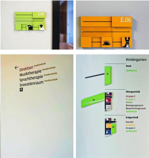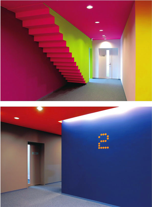從標識的設計到學校中心的設計,從上到下都是為了營造一個充滿視覺沖擊力的空間。標識突出了整個設計理念,從教學樓整體的建筑結構就可以知道教室的具體位置,Bohatsch und Partner設計工作室用立方體標識牌的設計來表示不同教室的功能,采用樹脂玻璃作為可拆除的標識牌,目的就是為了將教室的功能在必要時可以進行轉換。