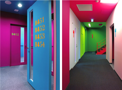 TERADADESIGN設計工作室負責對教室的室內顏色進行設計,同時也對學院的搖滾和流行樂教室進行導視系統(tǒng)設計。學院配備了錄音室、教學室和練習室,所有密封的教室都配備音樂教學設施。本來學院的教學氛圍就不太好,其中設備占了主要原因,設計師了解后決定嘗試用顏色改變學院的氣氛。不同顏色結合的同時也形成了學院獨特的特征,同時也可以作為學院的導視系統(tǒng)。