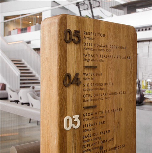 基于酒店名Six Senses,Federation設計機構設計了六個簡約的不規(guī)則圓點logo,象征著六種感覺。精神堡壘為流暢的立體折面,在內部設計了藍色的氛圍燈光,具有神秘感。戶外立式導視板由不規(guī)則木材和石材結合,擁有彎曲的線條,特別的是,在連接處設計了燈光照明,具有裝飾作用。室內采用較厚的圓角方形木材和石材相結合,具有厚重感,配色溫和,打造了優(yōu)雅的酒店環(huán)境。
