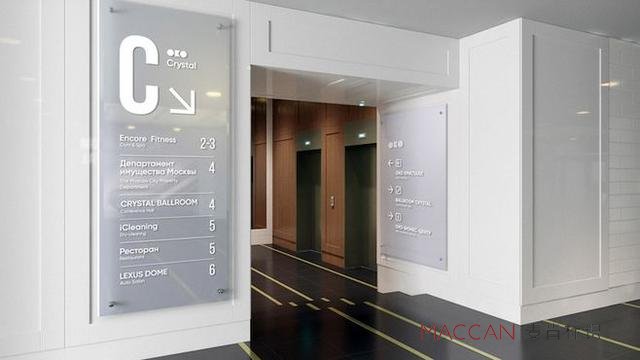 在此類空間的標識系統(tǒng)中,銀色(金屬色)常被用來作為背景色。金屬色相比其他顏色,更能凸顯其時尚的特點,很有身份象征,使用這類顏色作為背景可以獲得強烈的視覺沖擊感。此外,使用銀色背景搭配黑色字體,更有質(zhì)感,可以充分顯示公司實力,從而取得客戶的信任。